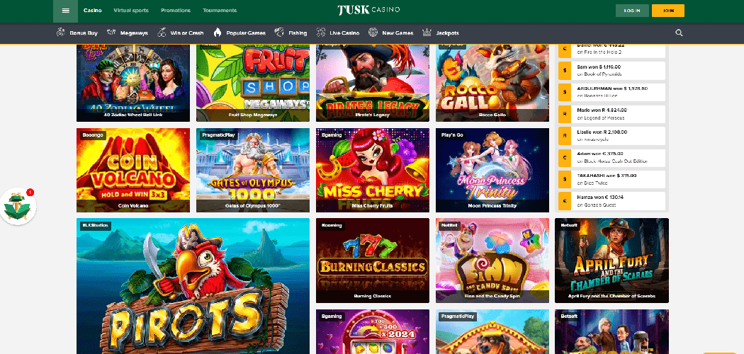Tusk Casino zeichnet sich durch eine Spielebibliothek mit über 2500 Spielen von mehr als 40 Anbietern aus. Bei den meisten Spielen handelt es sich um Spielautomaten, darunter Video-, Jackpot- und Megaways-Optionen. Das Casino bietet außerdem einen vielfältigen Live-Dealer-Bereich mit über 120 Live-Spielen, darunter Roulette, Blackjack, Baccarat und Poker.