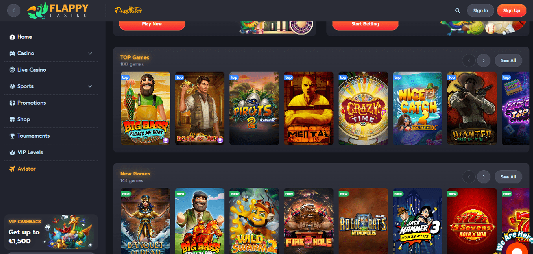 You will be overwhelmed with options when it comes to choosing which game to play first, thanks to the extensive library. Slot machines, table games, and crash games like Spribe's Aviator are all available at Flappy Casino.