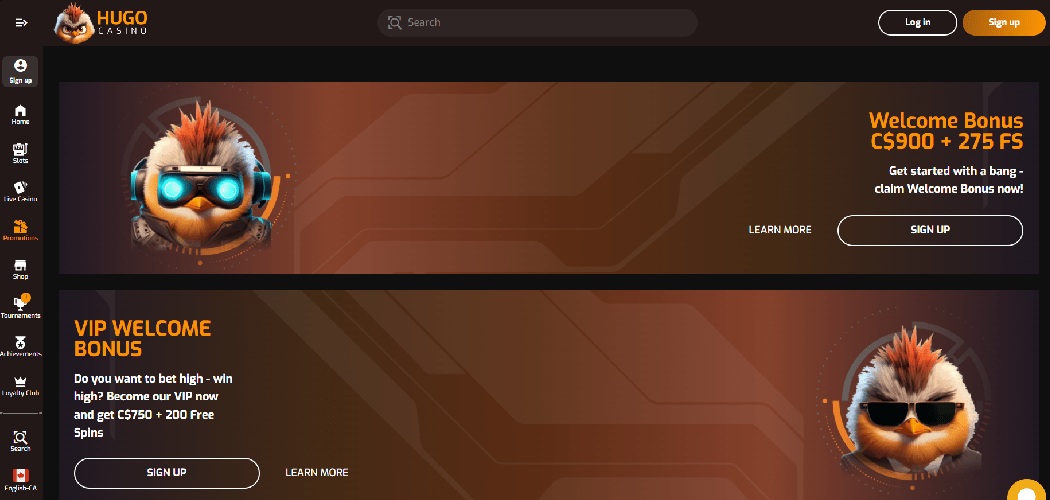 Hugo Casino stands out with its engaging graphic concept, featuring an irate yet endearing bird as its main character. The casino's astounding visual design, centered around this character, creates an immersive and captivating environment for players from the moment they start playing.
