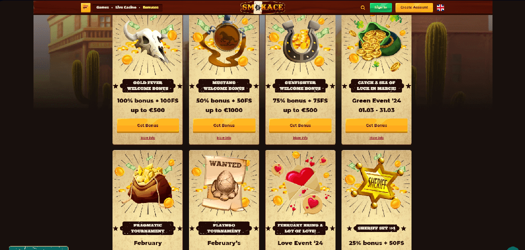Smokace wurde 2023 ins Leben gerufen und ist ein brandneuer virtueller Glücksspielort. Mit über 7.500 Spielen von weltbekannten Anbietern, darunter Play'N Go, Evolution, Netent, Red Tiger, Microgaming und unzähligen mehr, verfügt es über eines der umfangreichsten Spieloptionen der Welt. Es steht eine große Auswahl an Spielen zur Verfügung, darunter die neuesten und beliebtesten Spielautomaten sowie Blackjack, Roulette, Poker und mehr. Darüber hinaus ist die Website voller verlockender Werbeaktionen, die Ihre Stimmung heben und Ihre Chancen auf große Gewinne erhöhen.