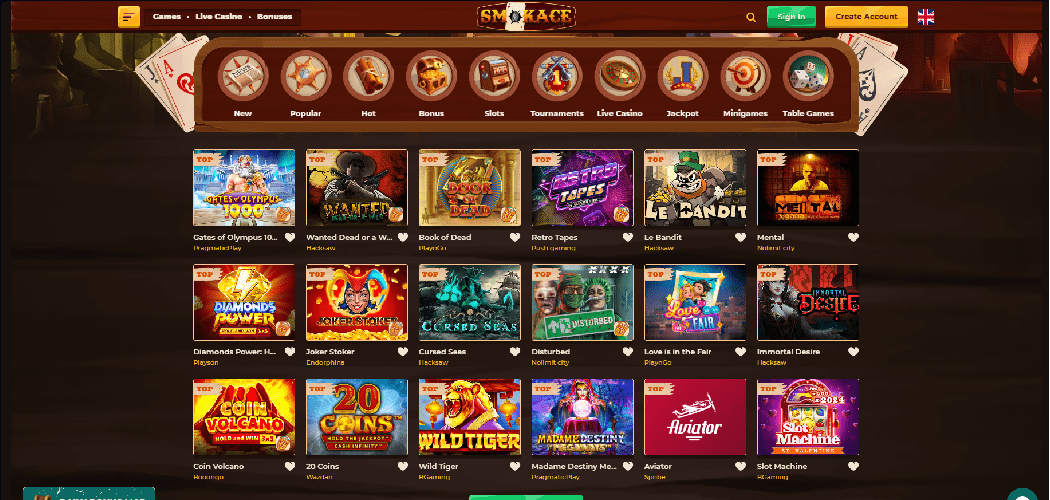 Smokace Casino zeichnet sich durch eine umfangreiche Spielbibliothek mit über 7.500 Titeln aus, darunter eine Vielzahl von Spielautomaten, Blackjack, Roulette, Poker und mehr. Renommierte Spieleentwickler wie Play'N Go, Evolution, Netent, Red Tiger, Microgaming, Pragmatic Play, Quickspin, Yggdrasil und viele andere tragen zu den vielfältigen Spielmöglichkeiten bei. Das Casino ermöglicht eine einfache Sortierung und Filterung nach Funktionen wie High Volatility, Megaways und bestimmten Anbietern und verbessert so das Spielerlebnis.