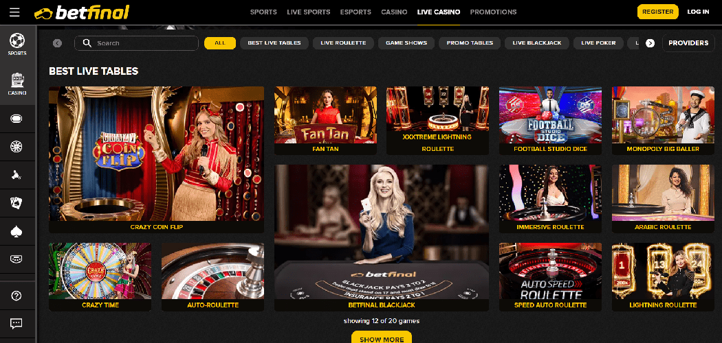 Poker, blackjack og rulett er alle tilgjengelige. Populære varianter inkludert amerikansk og europeisk rulett, single deck blackjack og utallige flere er også tilgjengelige. Hvis du heller vil spille keno eller bingo, kan det hende du finner et par av disse spillene her også. Ikke bare det. Med Betfinals flere live dealer-spill, kan du nyte all spenningen ved å spille med en ekte dealer mens du nyter all bekvemmeligheten ved å spille online. Liveversjoner av flere klassiske spill er tilgjengelig, inkludert rulett, blackjack, baccarat og poker.