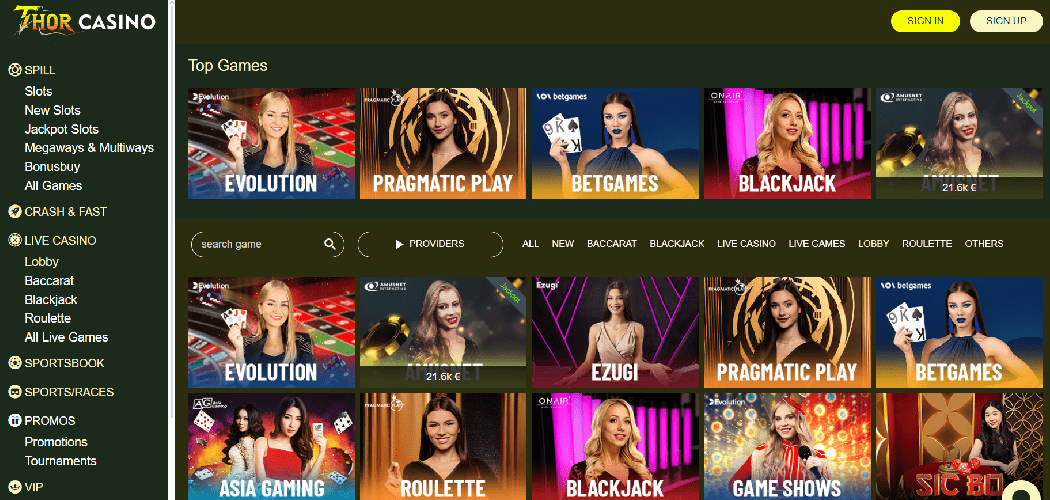 Hvilke typer spill er tilgjengelig hos Thor Casino, og hvilke fremtredende spillleverandører er knyttet til det?