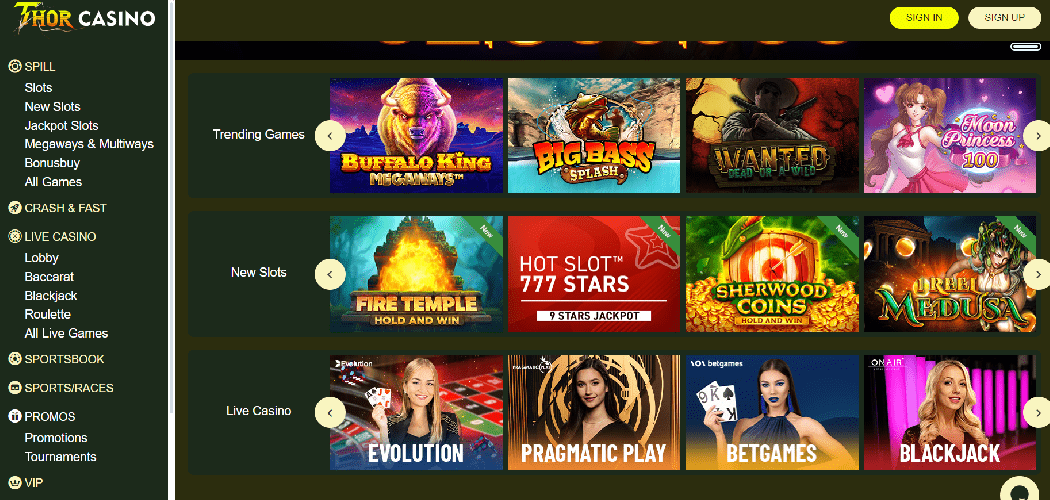Hos Thor Casino finner du et bredt utvalg av spill, inkludert mange alternativer av høy kvalitet. Blant de tusenvis av tilgjengelige spilleautomater er favoritter som Big Bad Wolf Megaways, Rosh: Immortality Cube, Deadly 5, Midway Money, Bass Boss og Animal Carnival.