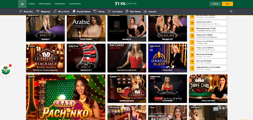 Spilleautomater, hvorav mange tilbyr video-, jackpot- og Megaways-alternativer, utgjør størstedelen av kasinoets spillbibliotek. Rulett, Blackjack, Baccarat og Poker er bare noen av de 120+ live dealer-spillene du kan satse på. Tusks sportsseksjon lar deg også spille virtuelle versjoner av populære sporter som fotball, tennis, hunde- og hesteveddeløp og mer. For å hjelpe deg med å avgjøre om det er verdt å satse med ekte penger, tilbyr de fleste spill demoversjoner.